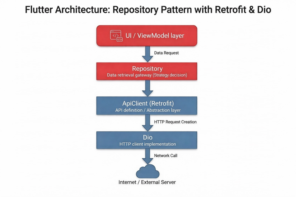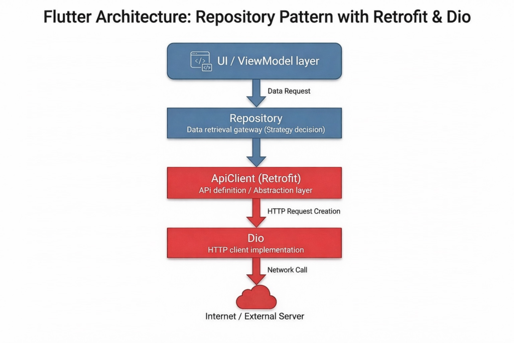 今回のPokemon Appでは、HTTP通信にDio、RESTクライアントにRetrofitを採用しました。この組み合わせは、Flutter開発における型安全なAPI通信のゴールドスタンダードとして広く使われています。