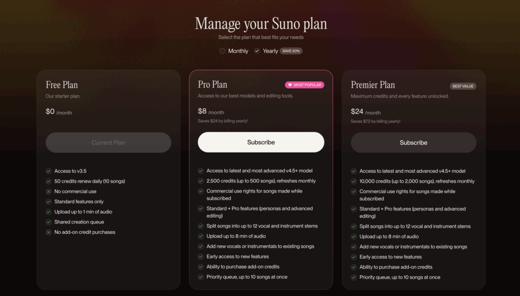プランについては後述しますが、理由はProプラン以上でないと、作成した楽曲の著作権が自分のものにならず、商用利用、つまり音楽配信サービスへのリリースができないからです。
