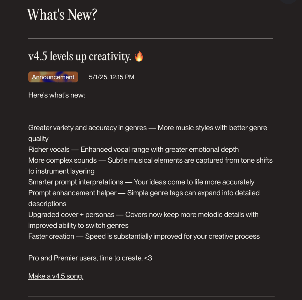 2025年5月にリリースされた最新バージョン「Suno v4.5」では、最大8分間の楽曲生成、豊かなボーカル表現、複雑なジャンル融合など、従来のAI音楽生成ツールの限界を大きく超える機能が実装されました。