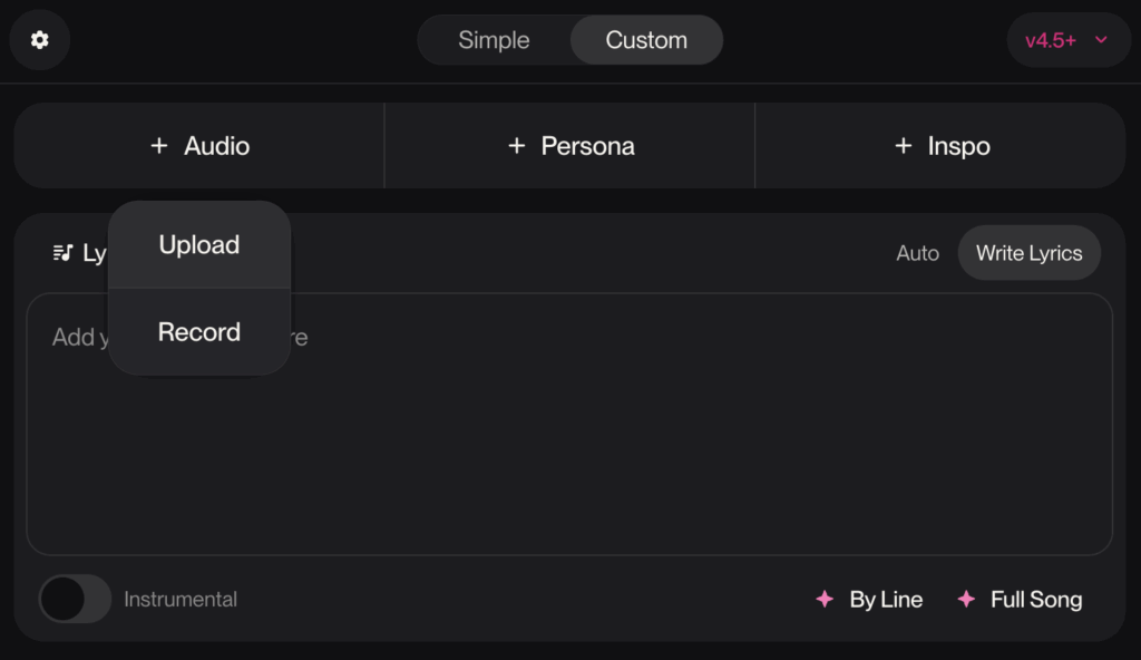 「Customモード」で「+ Audio」からUploadを選びます。