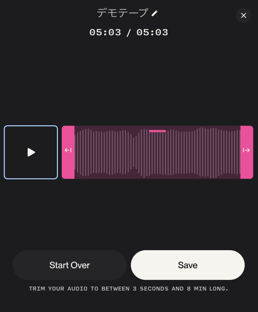 アップロードが完了すると、音源のどこを抽出するのか範囲を調整できます。