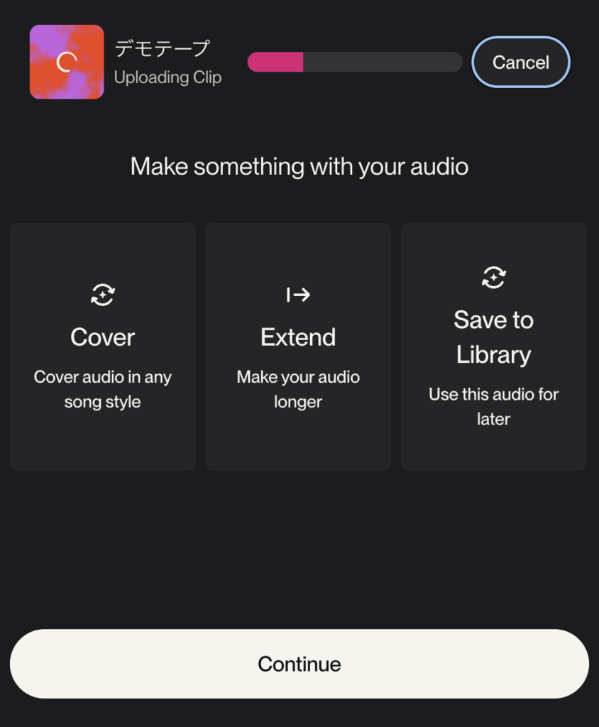次に、このデモテープを元に「Cover(カバー)」したいのか、「Extend(延長)」したいのか、一旦「Save to Library (ライブラリに保存)」したいのか聞かれます。