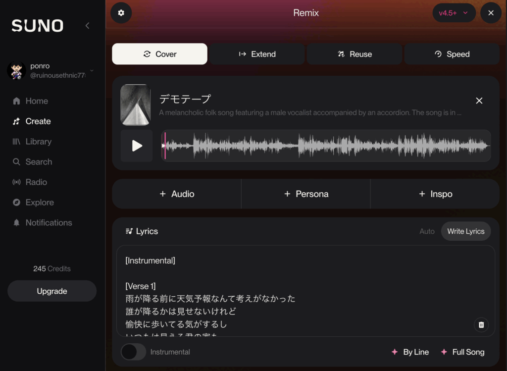ここで、自動的にデモテープで歌っていた歌詞が文字起こしされて、自動的にLyricsに入力されています。