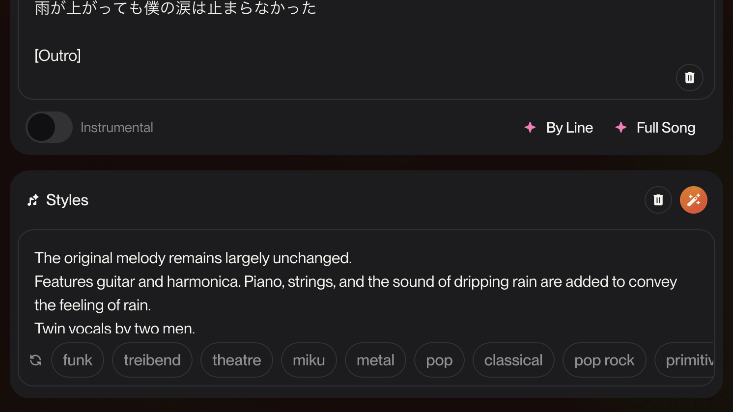スタイルに合わせた歌詞を作成し、歌として仕上げてくれます。