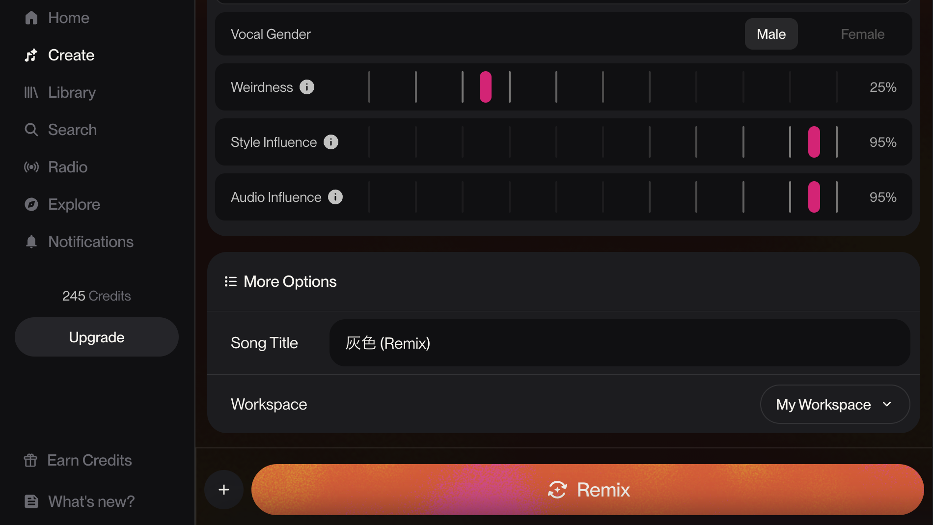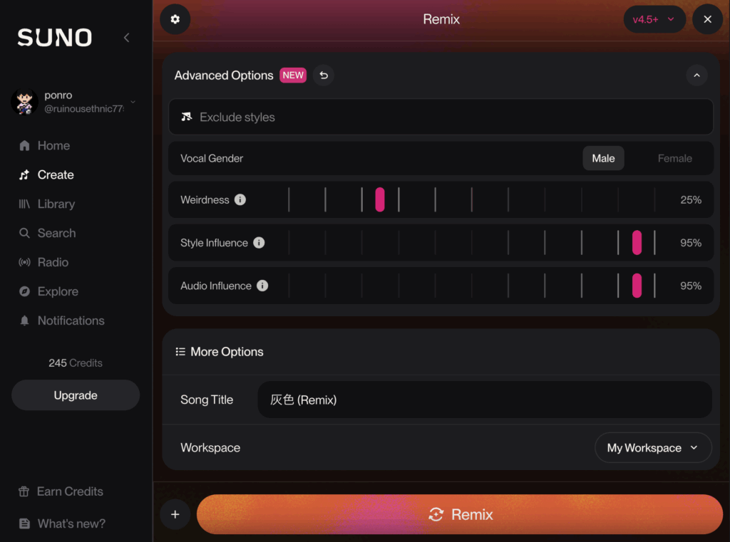 今回の場合は、原曲を入力していたため、表記がRemixとなっています。この「Remix」ボタンを押して曲を作成します。