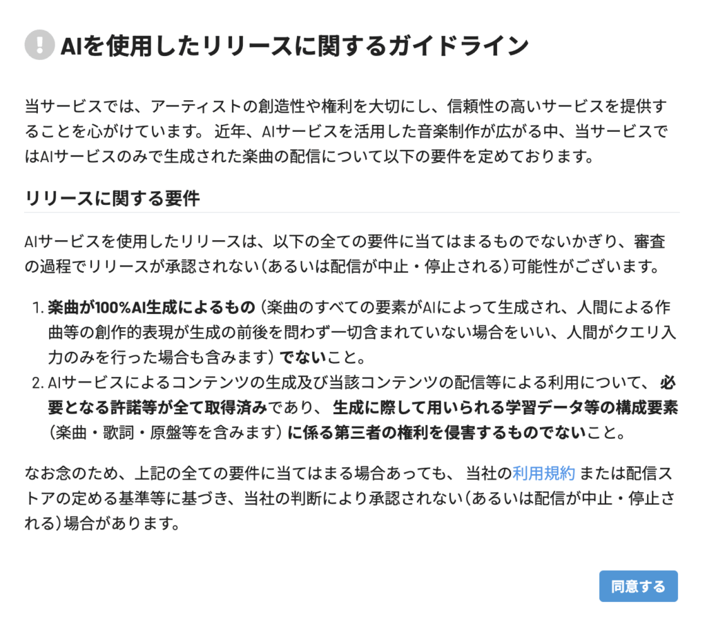 重要: AI楽曲のアップロードが許可されていないディストリビューターもあるため、利用前に必ず各サービスの最新利用規約を確認してください。