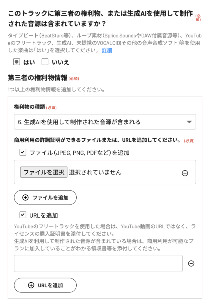 - 第三者の権利物、生成AIを使用して制作された音源が含まれるか: はい/いいえを選択 (必須)