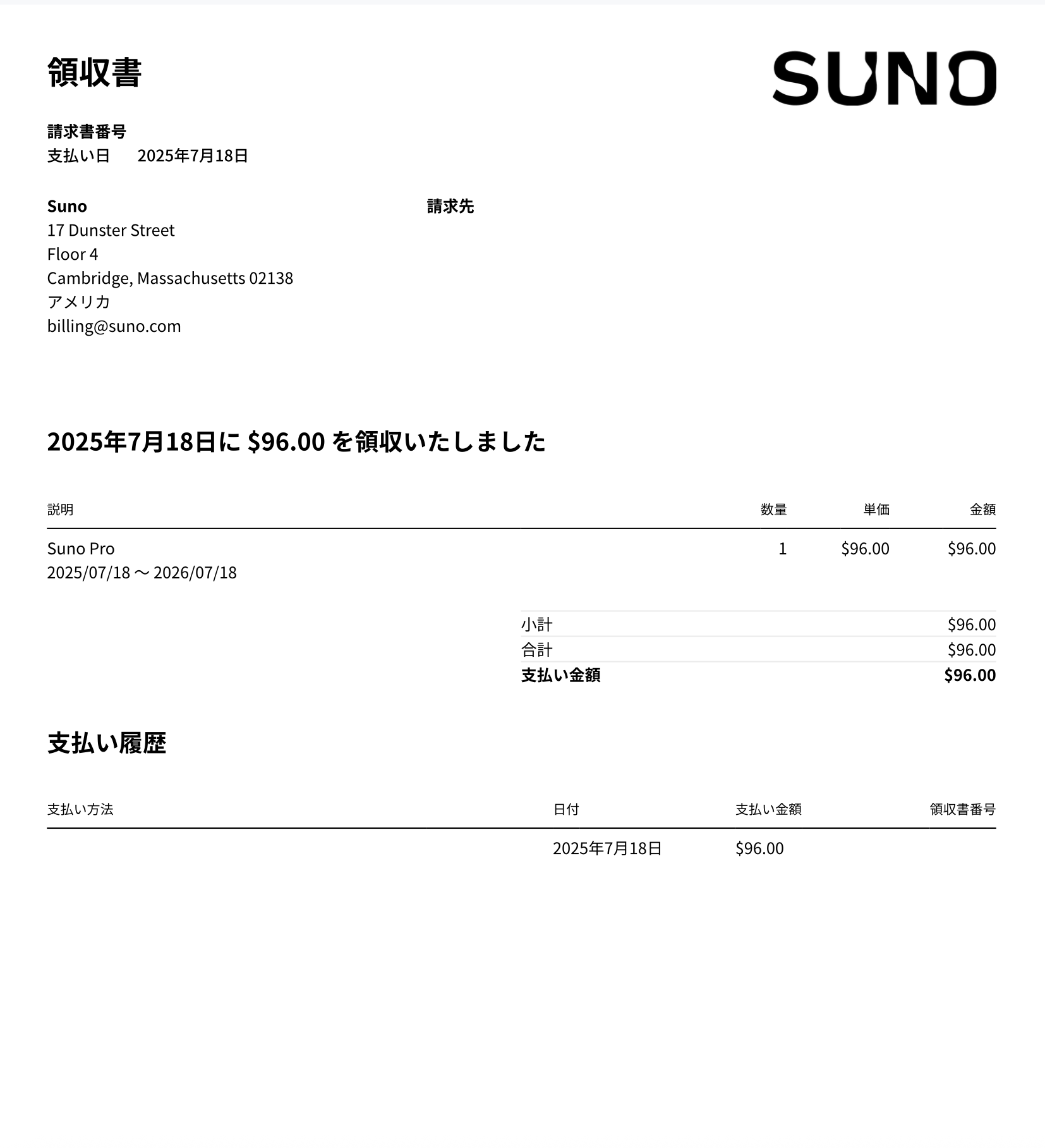 したがってSUNOのProプランの領収書がメールで届くはずなので、それをそのまま設定してあげれば問題ありません。