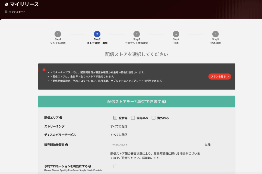 前述の楽曲情報の入力画面で「ストア選択へ」ボタンを押すと以下のようなページが表示されます。