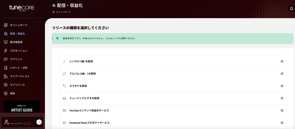 私の場合は、5曲以上のリリースする予定があったので、Unlimitedにしました。