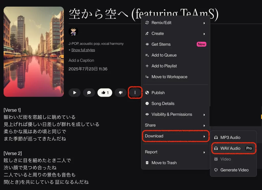 生成された楽曲は、SUNOの該当の楽曲より以下の手順で保存できます。