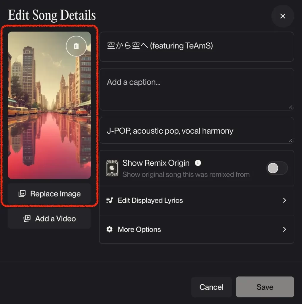 また、画像をAIに任せて作り直したい場合は、SUNO上で「Replace Image」よりプロンプトで細かい指定をして画像生成することも可能です。