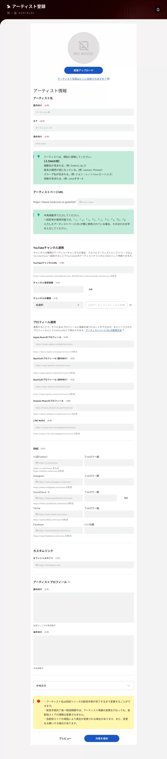「リリース情報」、「楽曲を追加する」それぞれにおいて、以下のような項目を入力します。